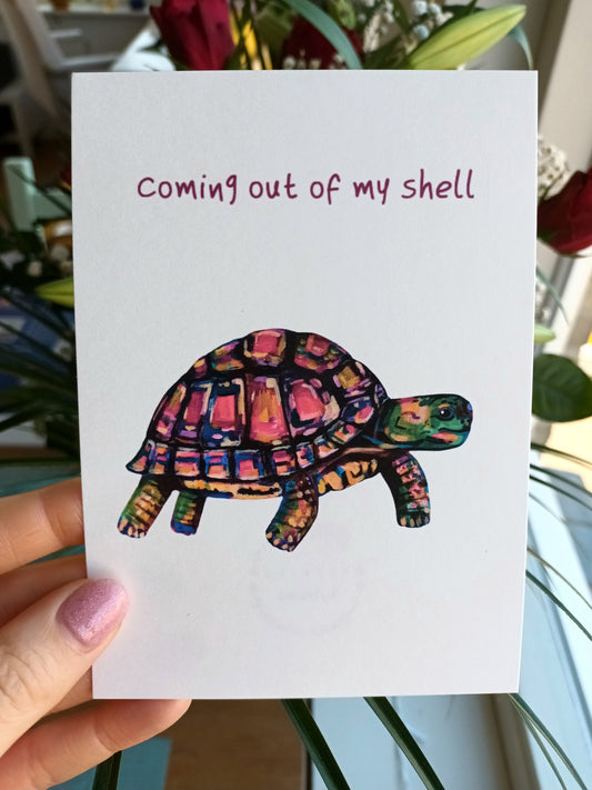 Colourful Turtle Postcard – Cute Turtle Emerging from Shell, Handmade Art Card