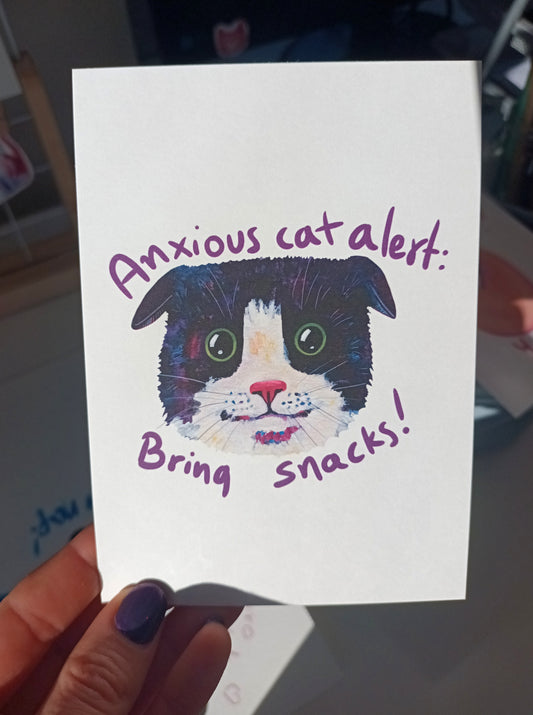 Anxious Cat Alert: Bring Snacks Postcard – Cute & Humorous Greeting Card