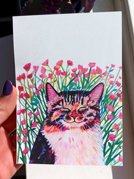 Spring Art Card – Cute Cat in a Meadow of Pink Flowers