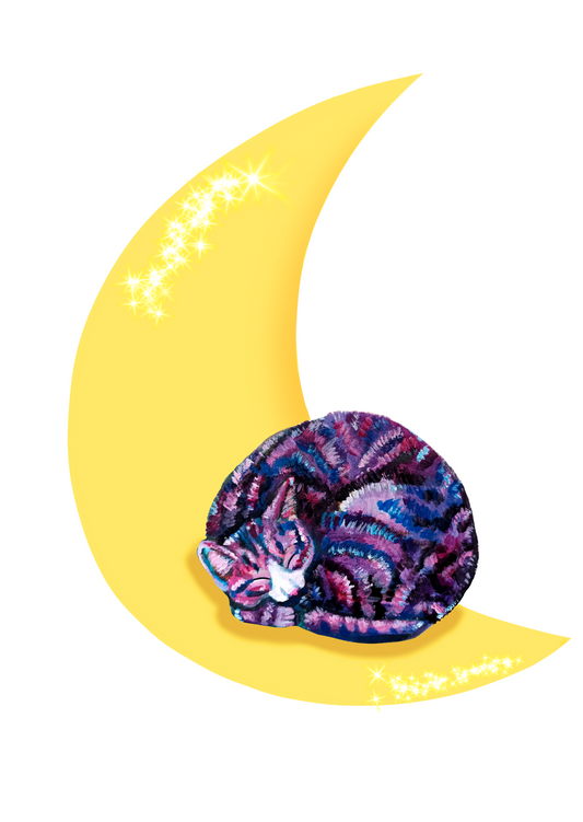 Purple Cat Sleeping on Moon Postcard – Dreamy & Cute Celestial Art Card