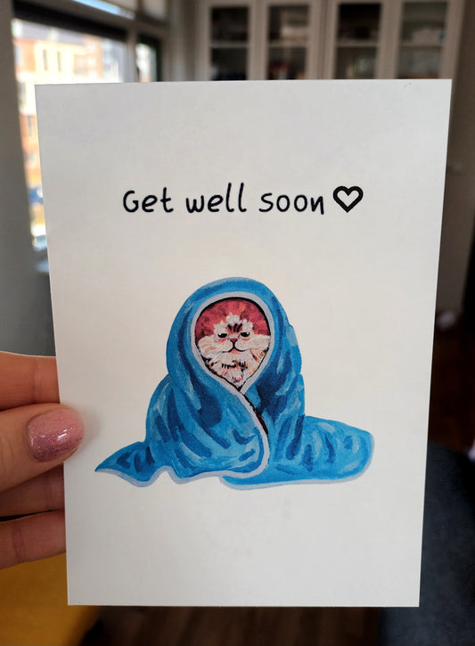 Get Well Soon Card – Cozy Cat with Blanket, Cute & Comforting Greeting Card