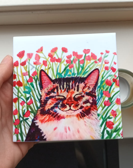 Cute Cat in Pink Flower Meadow Ceramic Tile – Tile printed by the artist